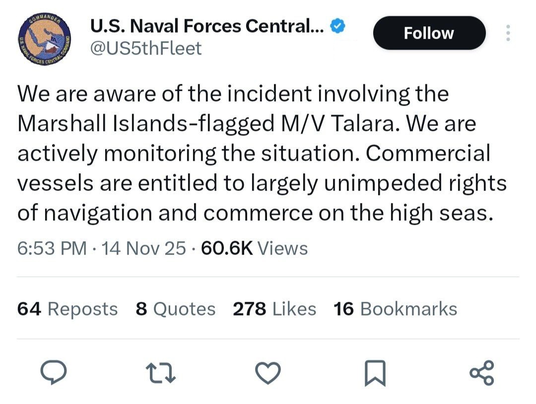 در سوی دیگر، آژانس نیروی دریایی بریتانیا (UKMTO) این عملیات را «احتمالاً اقدامی دولتی» دانست و هشدار امنیتی برای ناوگان تجاری منطقه صادر کرد.